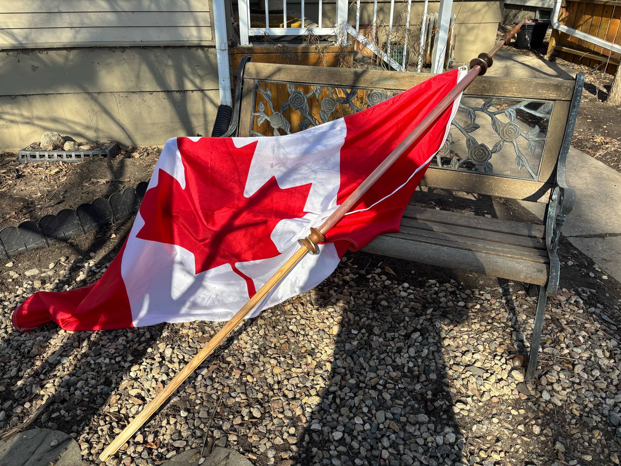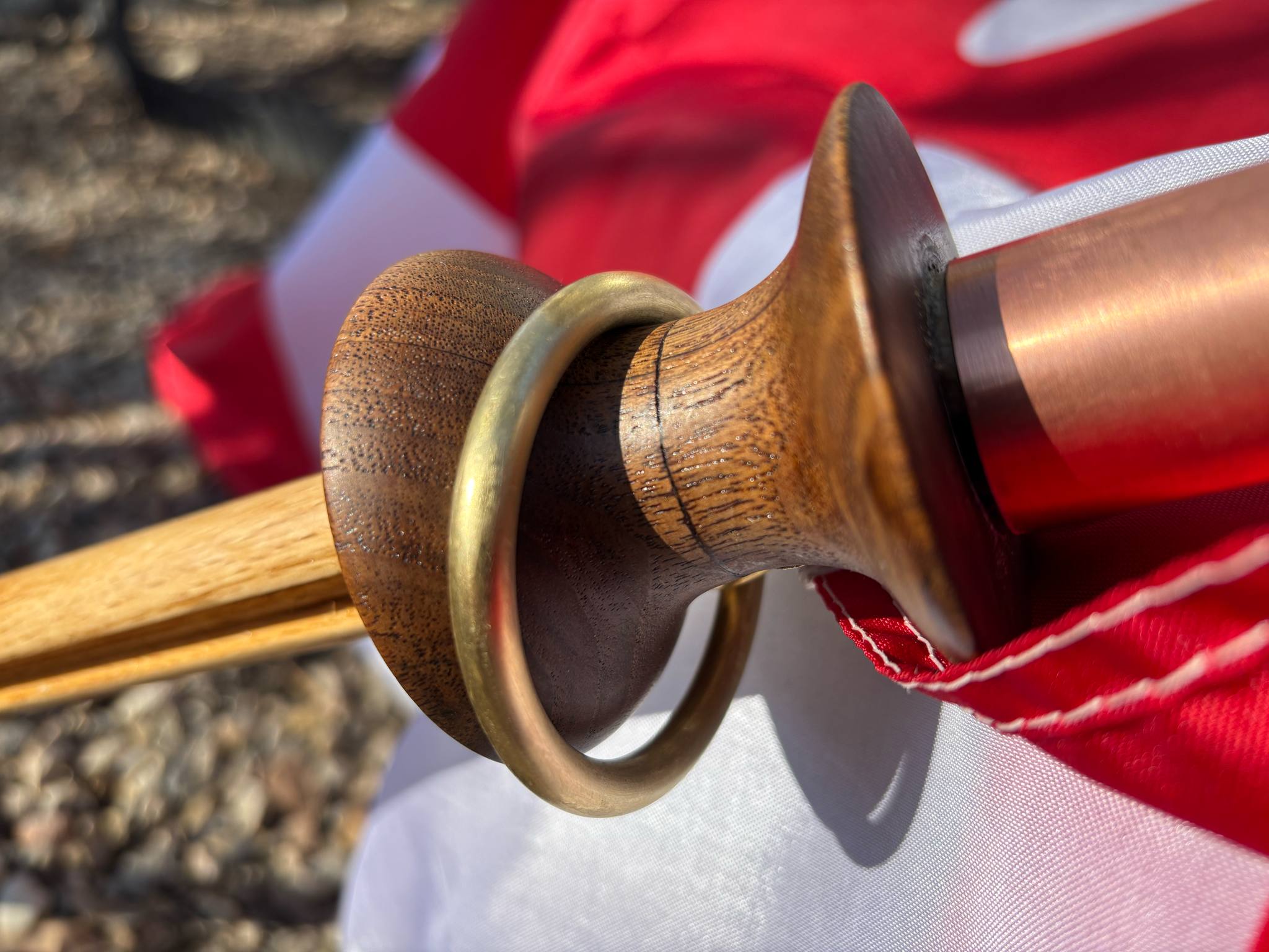 The most difficult aspect of this design was perfecting the anti-furl action. The brass rings that are captured on the teak roundels are intended to allow the flag to freely swing about the pole without furling itself. Initially, the flag was attached to the rings on the flag pole by a single split brass ring, so that the base of the flag was pulled taught. However, the flag would repeatedly furl itself around the pole. Adding a second rind to each end of the flag improved the furling performance somewhat, but the flag would still need to be manually unfurled at least once a week. Adding a third ring to each end of the flag solved the problem, so that the flag now unfurls by itself with no need for manual unfurling.